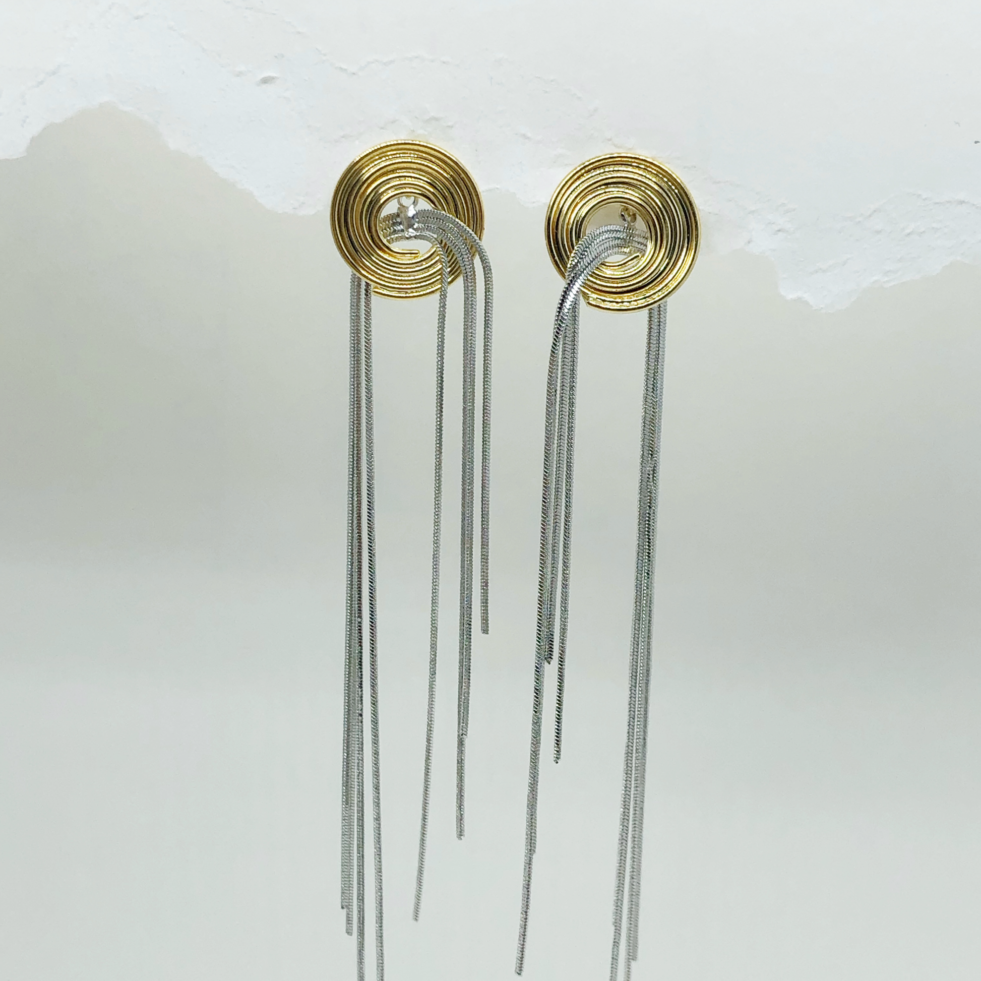 ARETES LARGOS, DORADO Y PLATEADO, 10 CM APROX, RODIO.