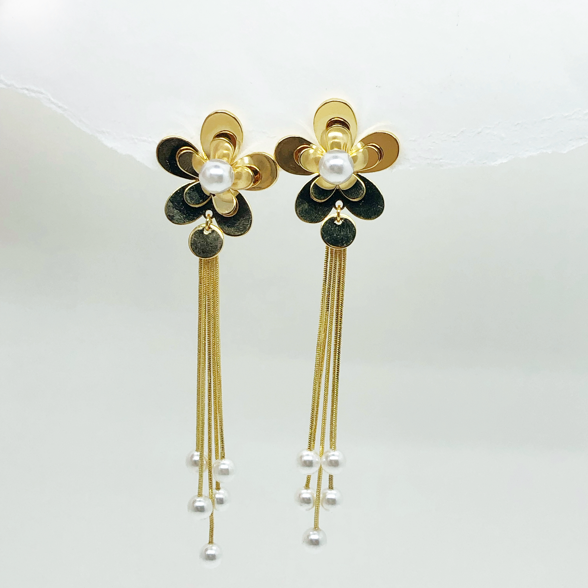 ARETE FLOR DORADO CON PERLA, 9CM APROX, RODIO.