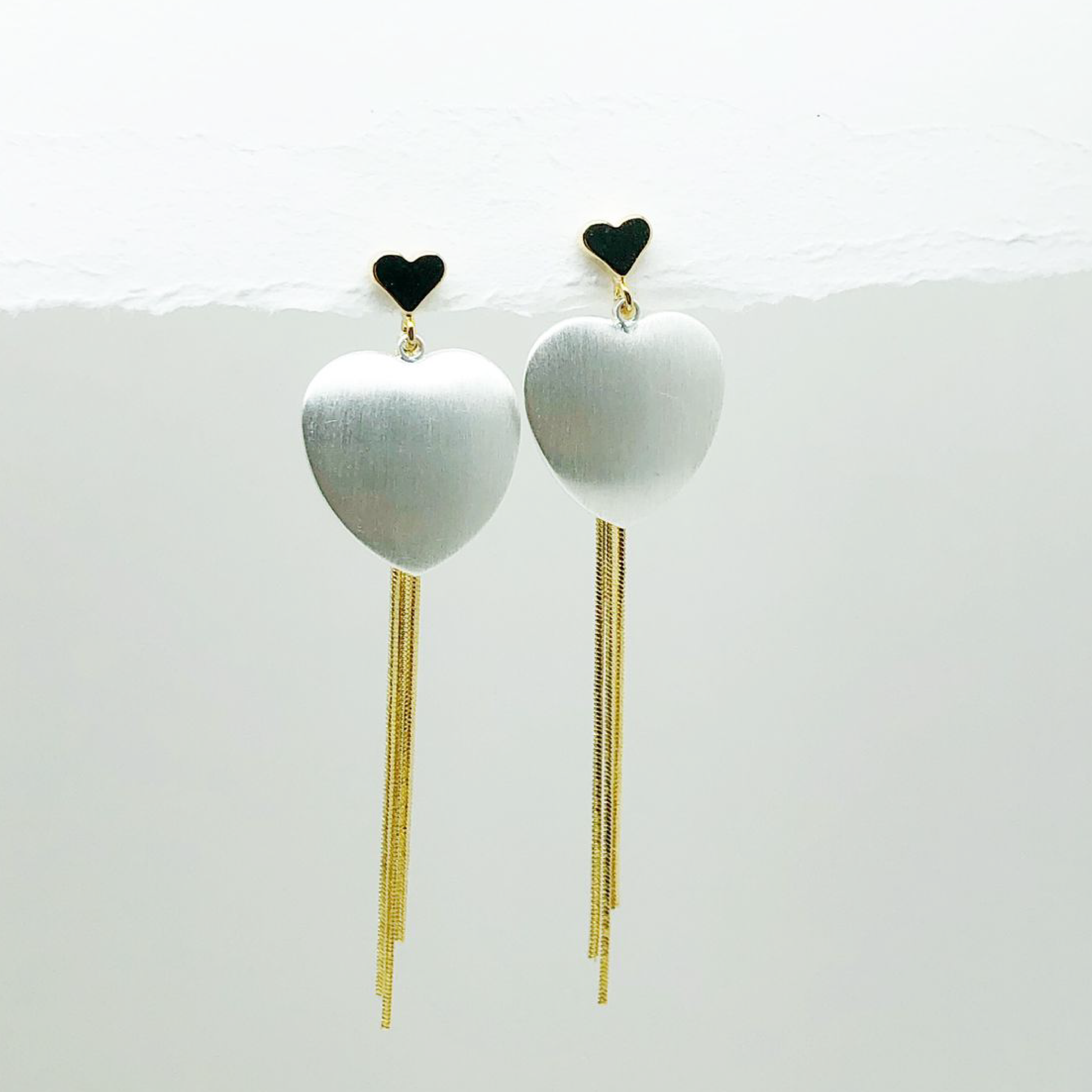 ARETE LARGO CORAZONES, PLATEADO MATTE CON DORADO, 6 CM APROX, RODIO.