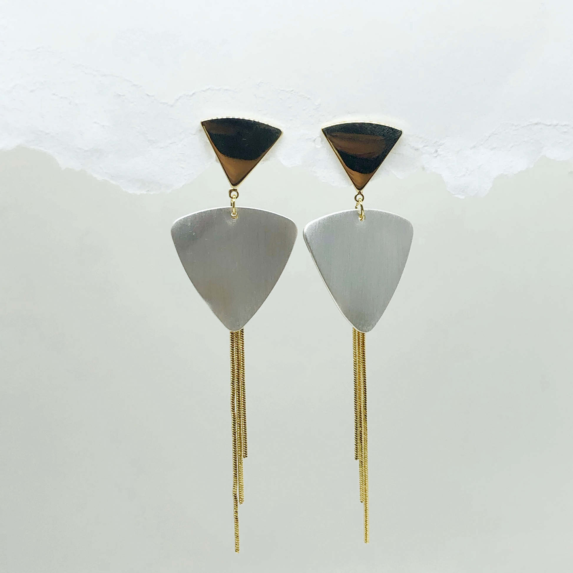 ARETE LARGO EN TRIANGULO, DORADO CON PLATEADO, 6 CM APROX, RODIO