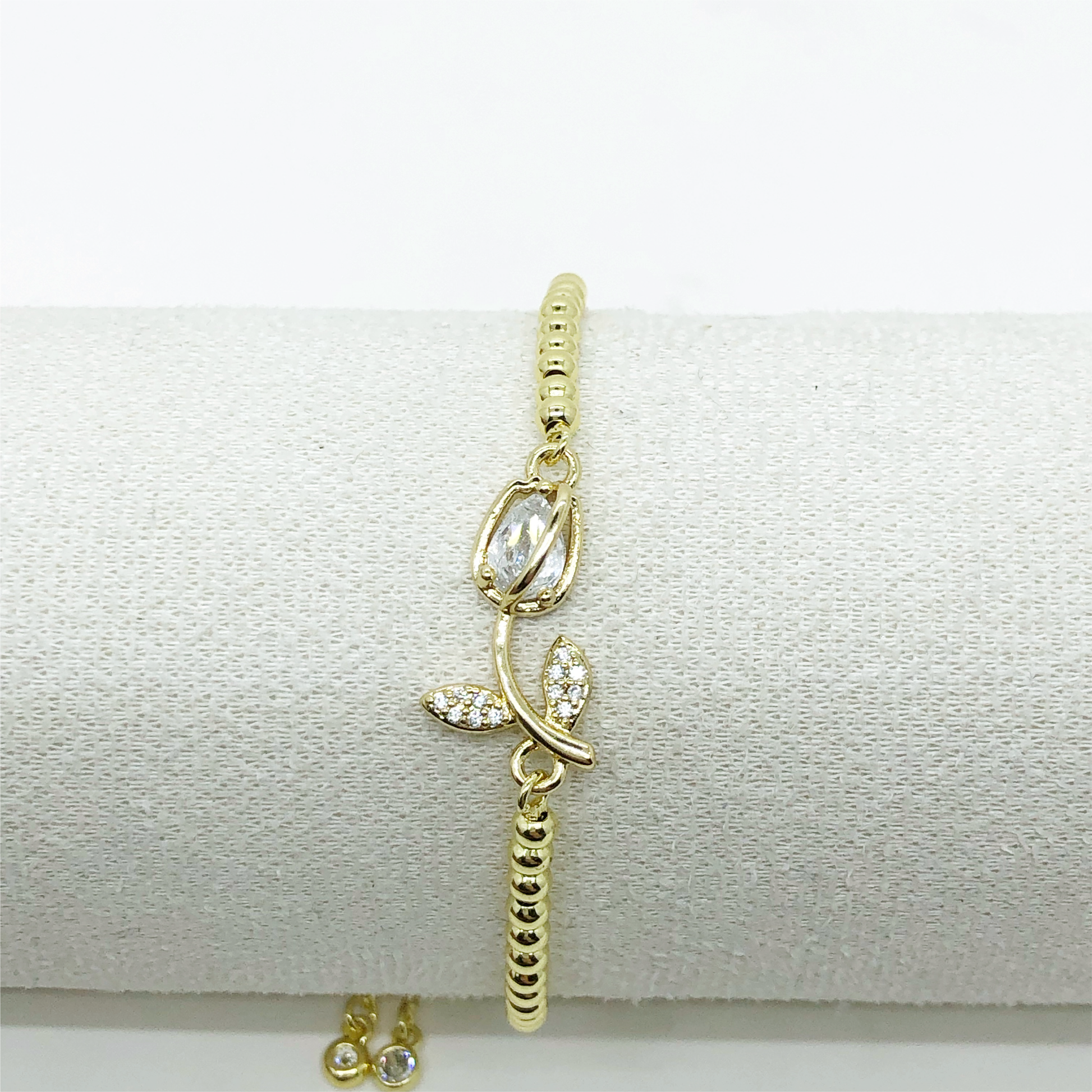 PULSERA DORADA DIJE FLOR CON CIRCONES, GRADUABLE, RODIO