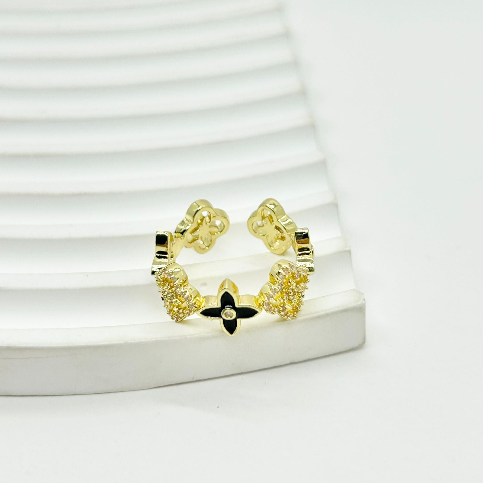 Anillo trébol negro en baño de rodio que asegura un brillo duradero y mayor resistencia a la corrosión, ideal para un uso diario con estilo refinado y protección contra el desgaste.