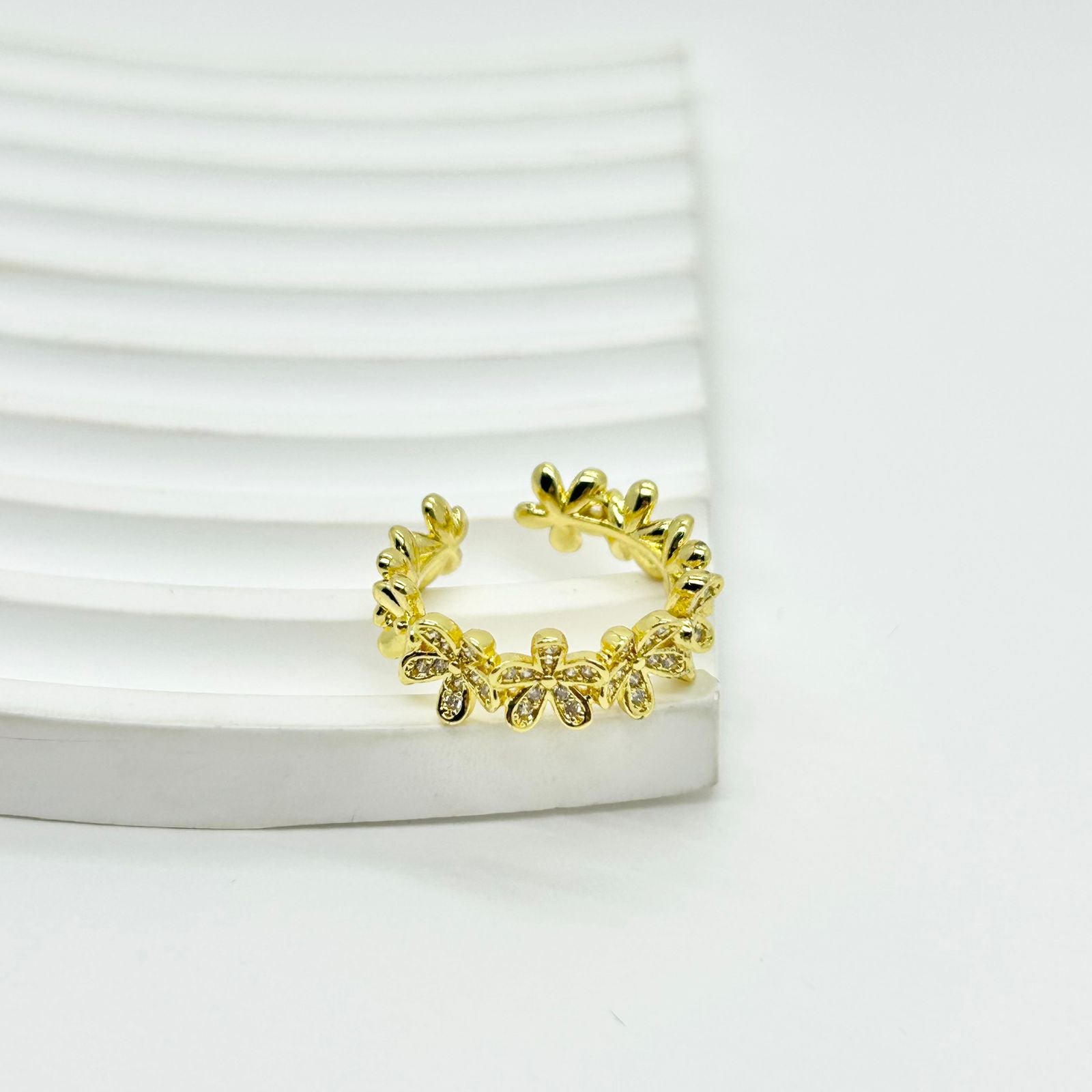 Anillo flores con circones en baño de rodio que asegura un brillo duradero y mayor resistencia a la corrosión, ideal para un uso diario con estilo refinado y protección contra el desgaste.