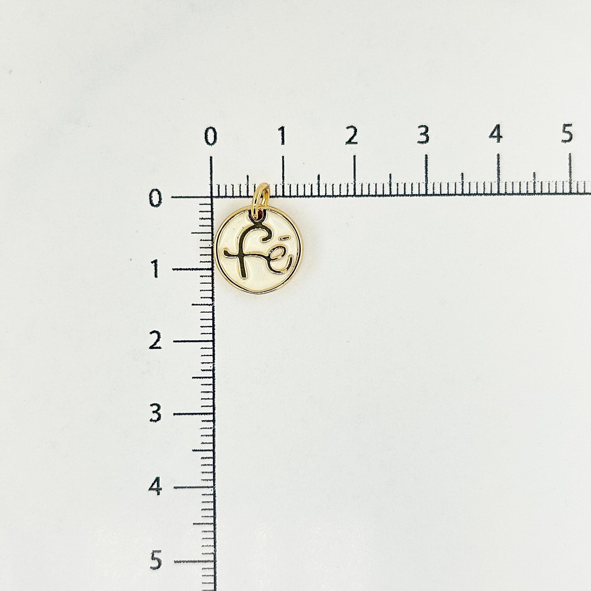 Dije en forma circulo con palabra Fé en baño de rodio.