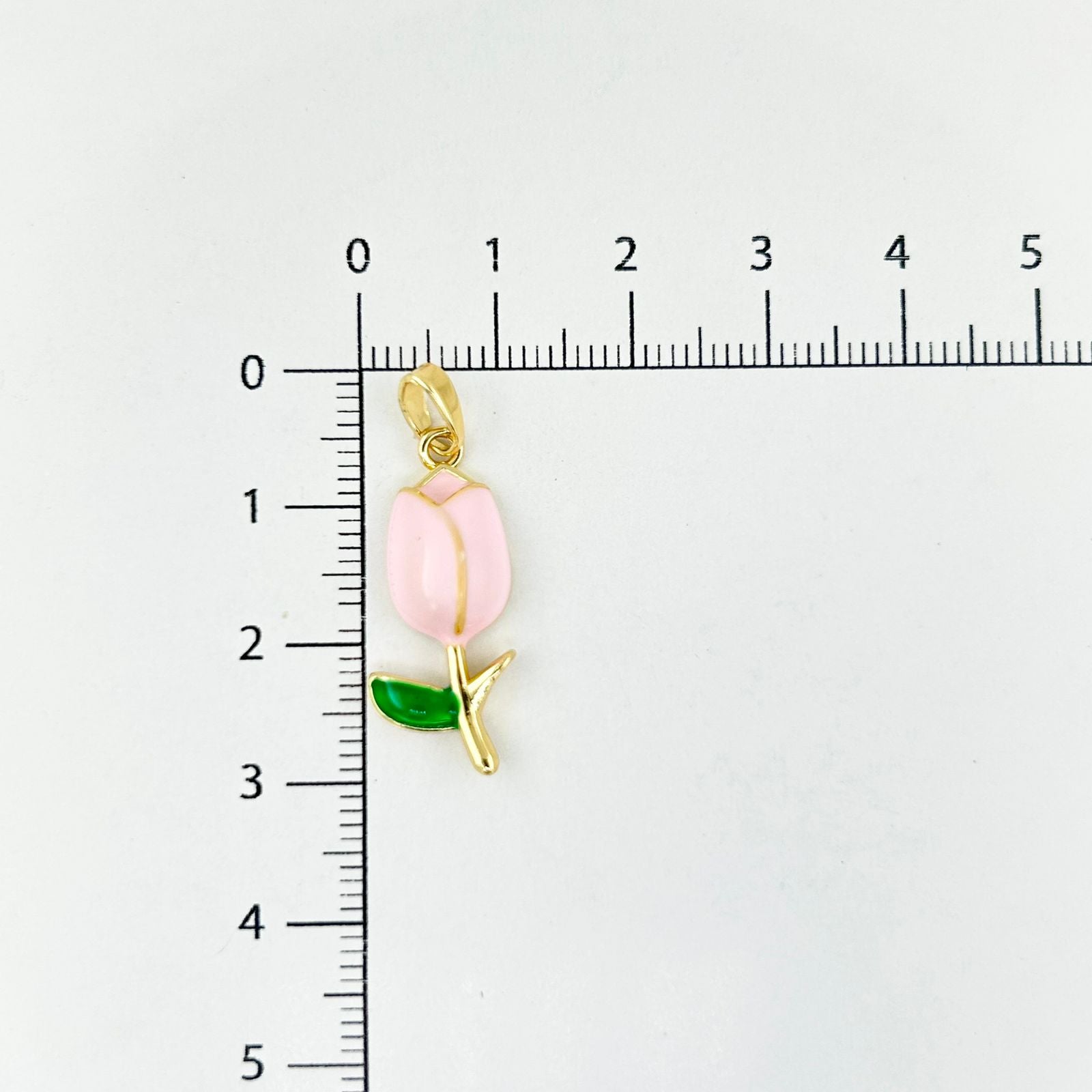 Dije de tulipán rosado con baño de rodio, que combina un diseño elegante con resistencia al desgaste y un acabado brillante, ideal para añadir un toque sofisticado a cualquier conjunto.