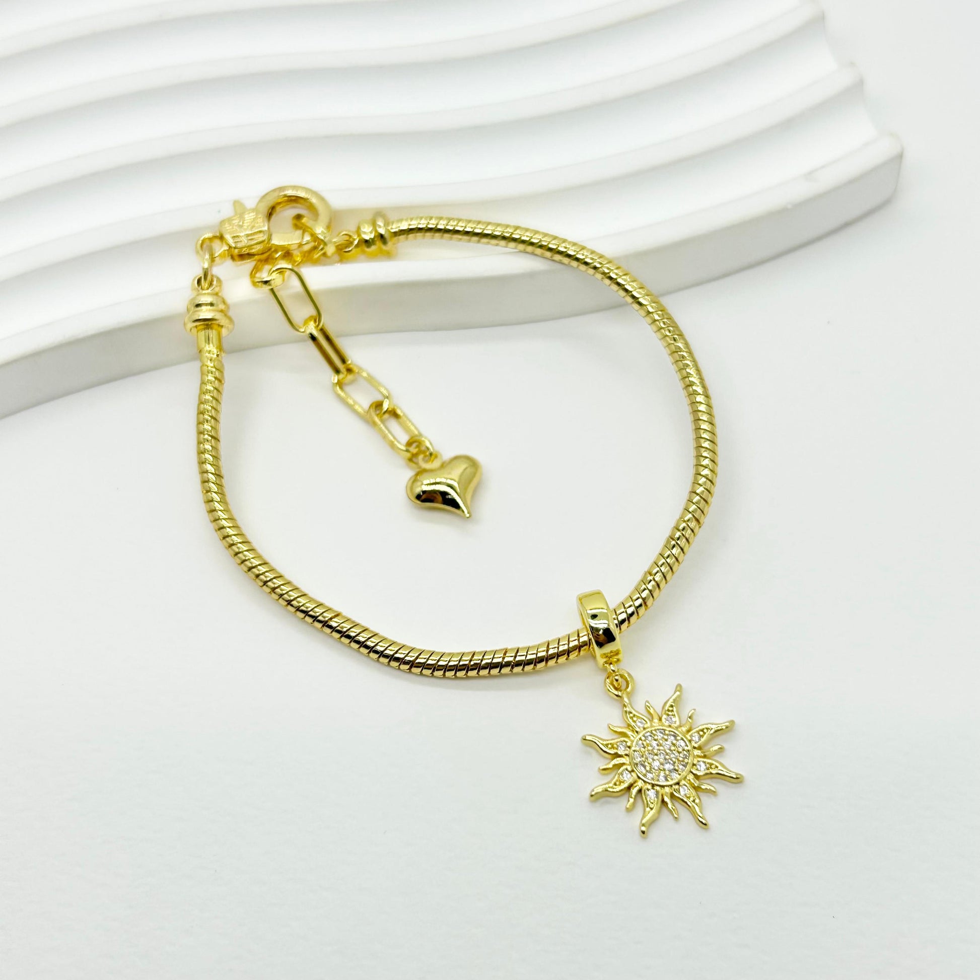 Pulsera en rodio con diseño de sol, que combina durabilidad y estilo sofisticado en una pieza corta ideal para uso diario y ocasiones especiales.