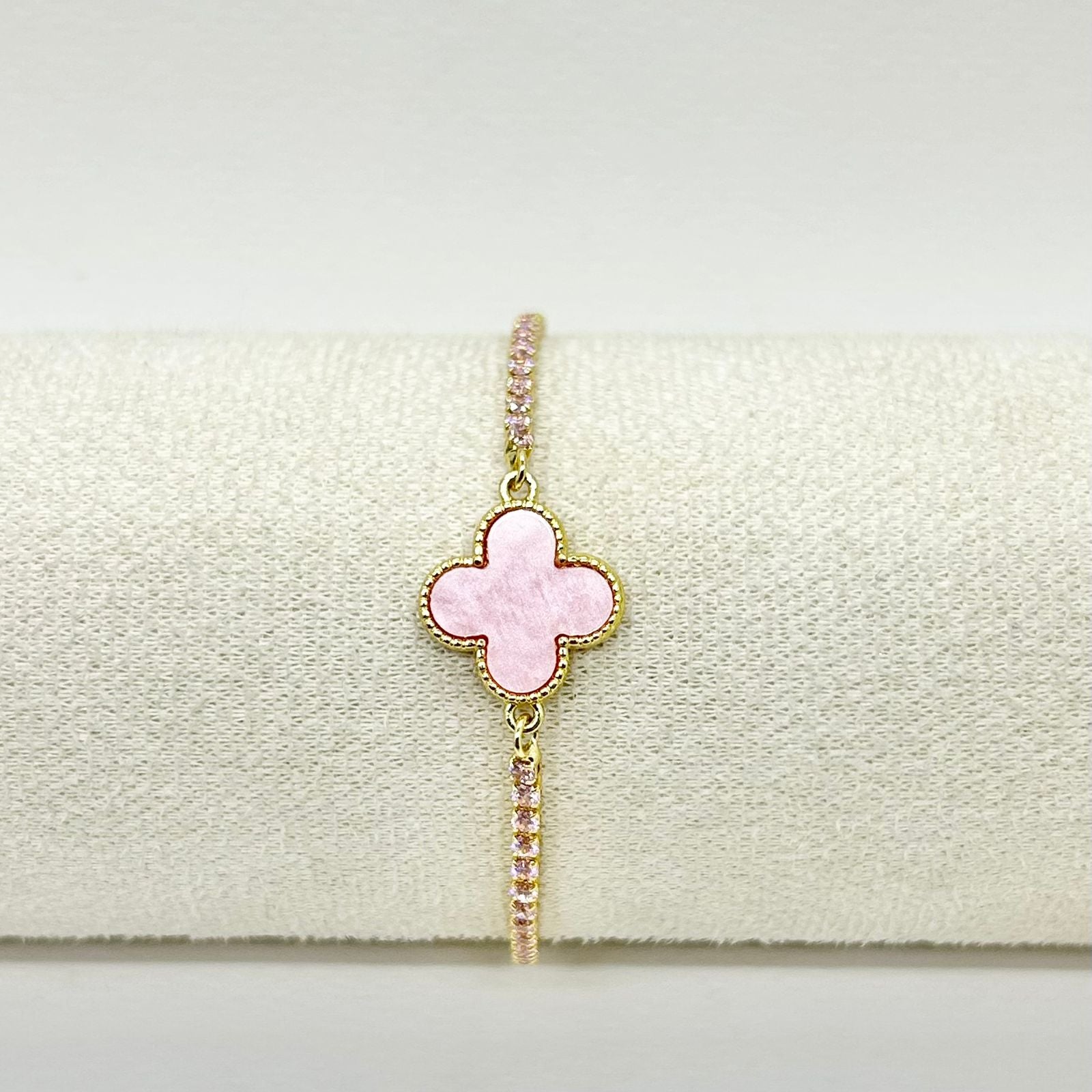 Pulsera trébol circón rosado con baño de rodio, que ofrece brillo duradero y resistencia al desgaste. Su diseño sofisticado aporta elegancia y versatilidad a cualquier atuendo.