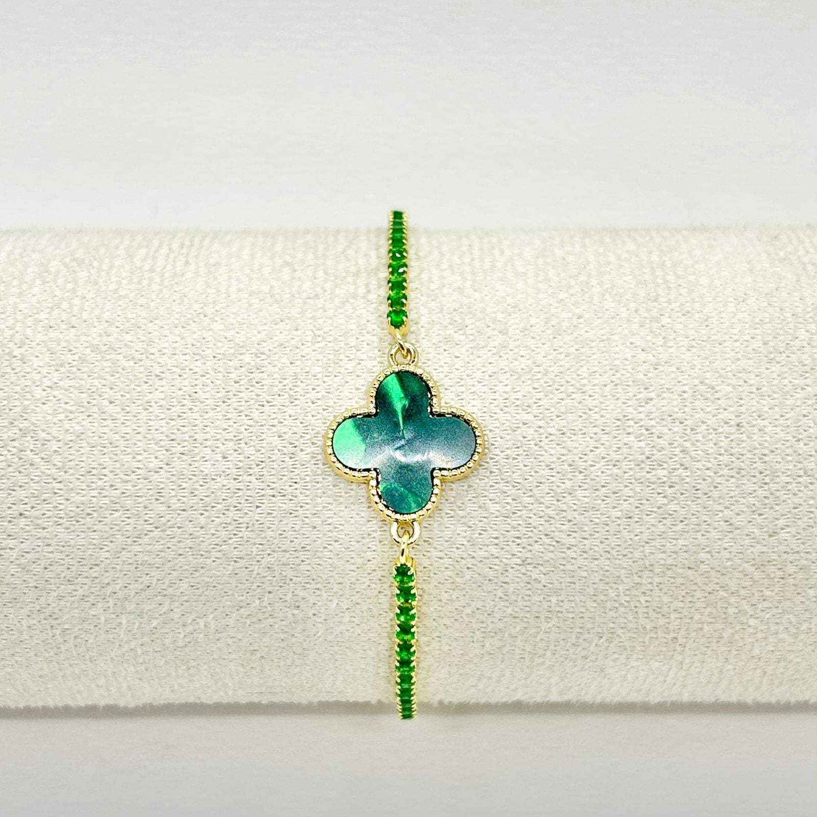 Pulsera trébol circón verde con baño de rodio, que ofrece brillo duradero y resistencia al desgaste. Su diseño sofisticado aporta elegancia y versatilidad a cualquier atuendo.