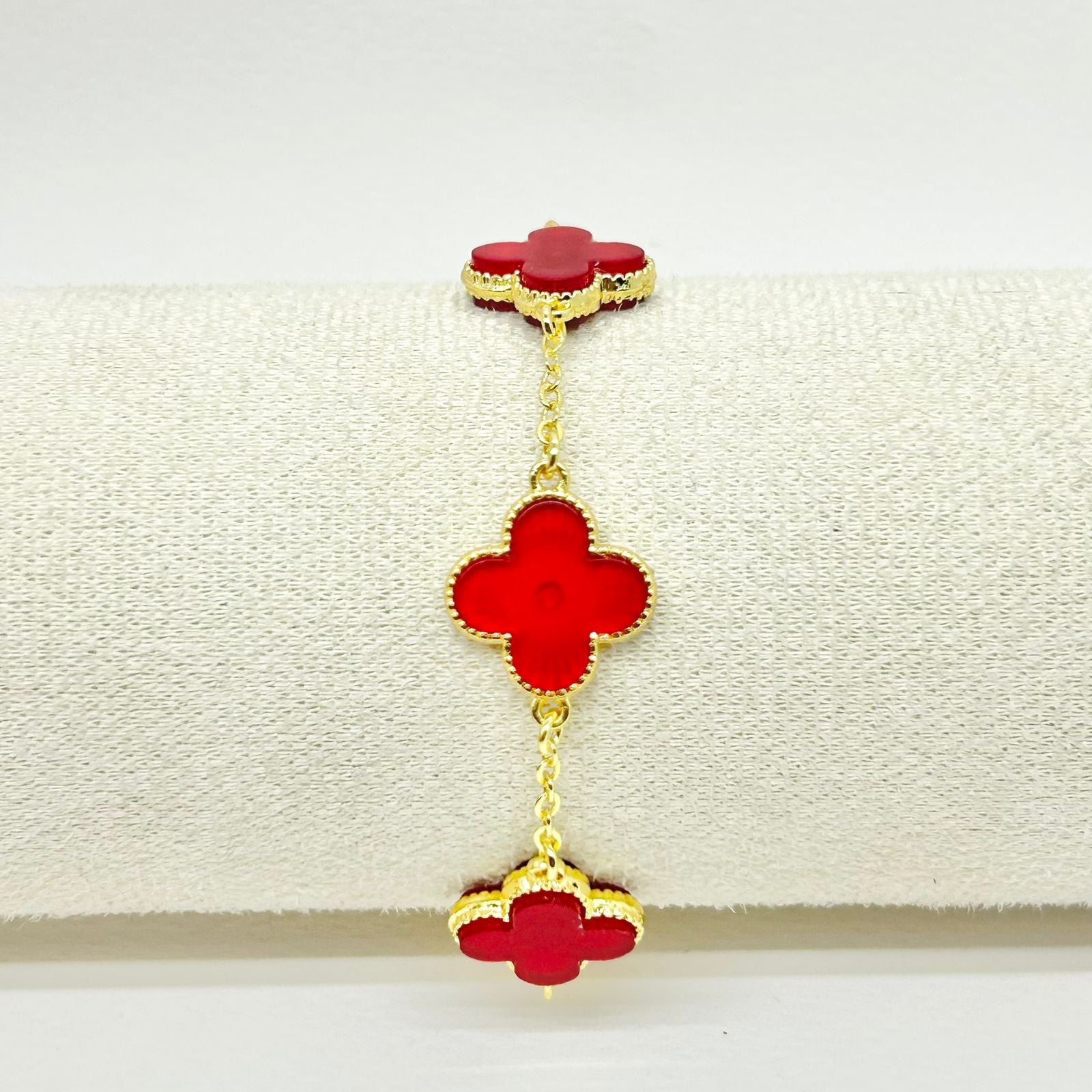 Pulsera de trébol roja con baño de rodio que garantiza resistencia y un acabado brillante, ideal para un estilo elegante y duradero.