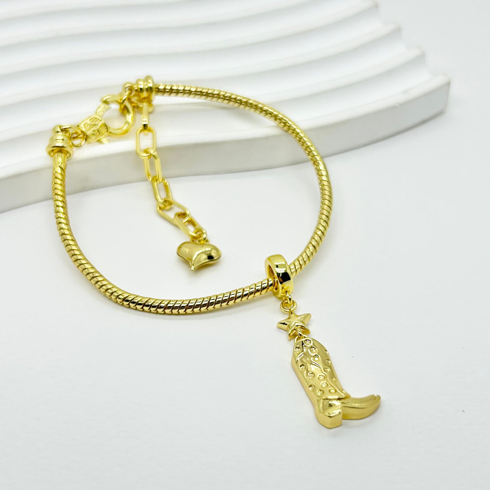 Pulsera en rodio con diseño de bota, que combina durabilidad y estilo sofisticado en una pieza corta ideal para uso diario y ocasiones especiales.