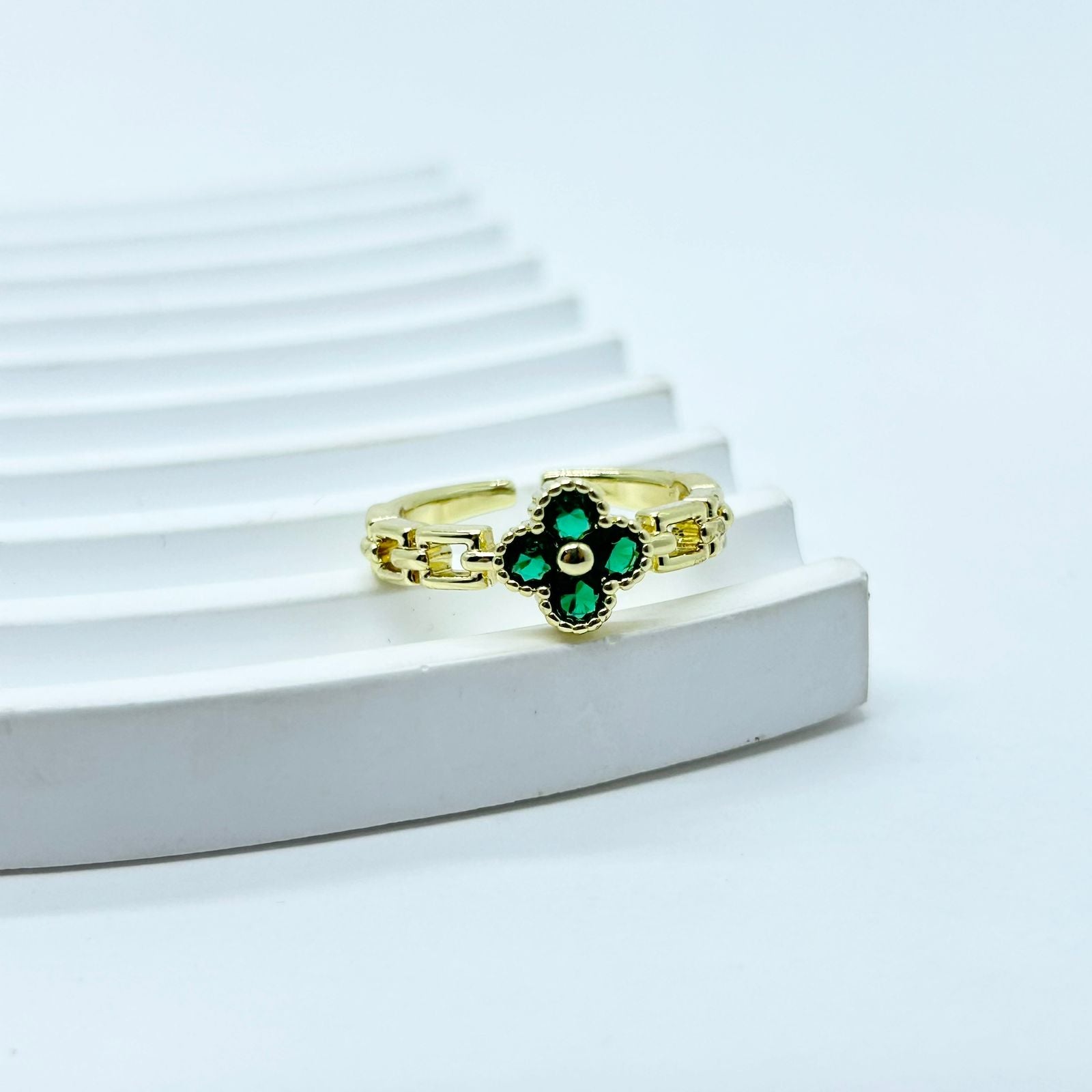 Anillo bañado en rodio de trébol verde.