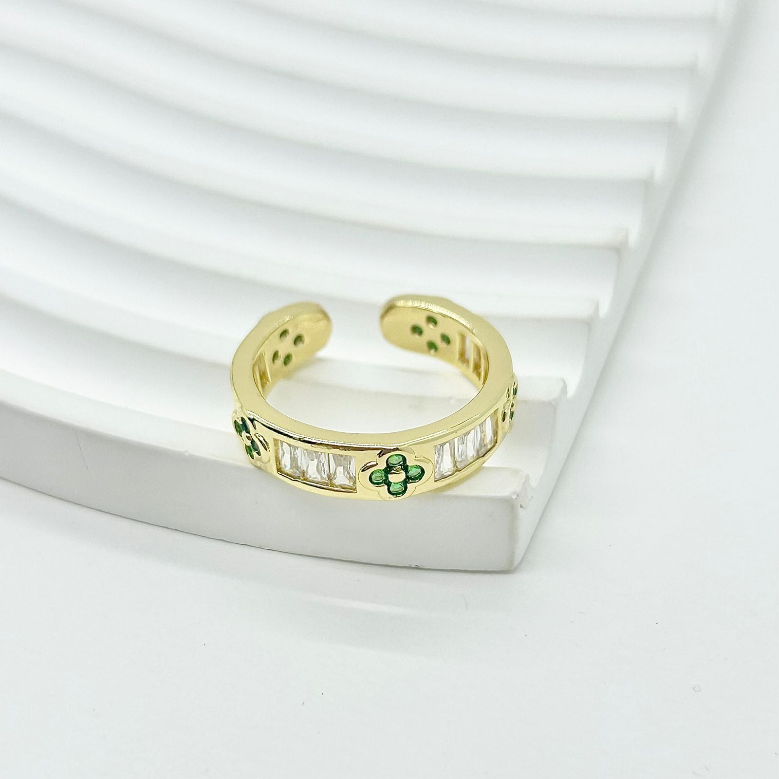 Anillo en circones con cinco tréboles verde bañado en rodio.