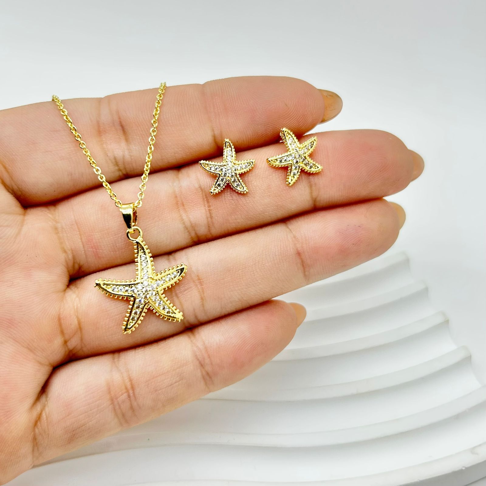 Set de estrella de mar en rodio que destaca por su diseño elegante y duradero. Su acabado en rodio garantiza brillo y resistencia, ideal para realzar cualquier estilo con un toque sofisticado y romántico.