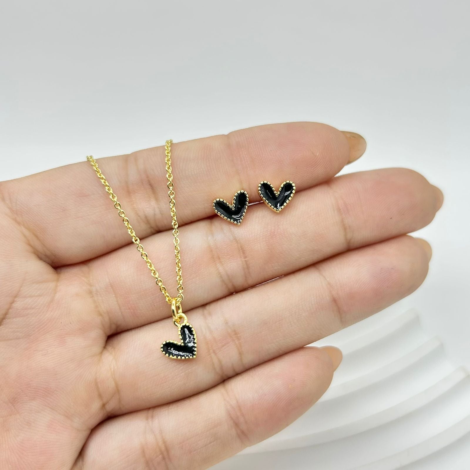 Set de corazon pequeño negro en rodio que destaca por su diseño elegante y duradero. Su acabado en rodio garantiza brillo y resistencia, ideal para realzar cualquier estilo con un toque sofisticado y romántico.