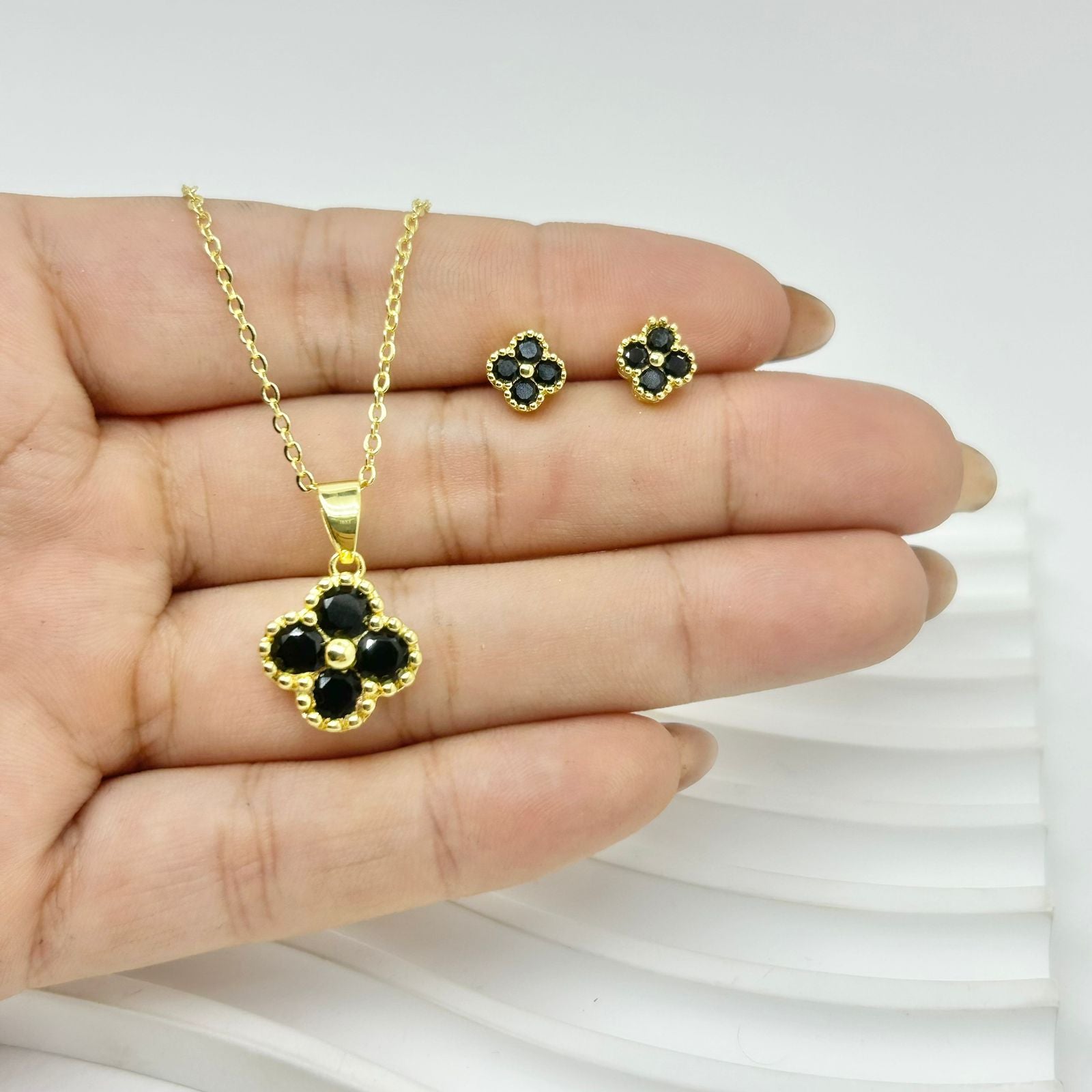 Set completo de trébol negro en baño de rodio.