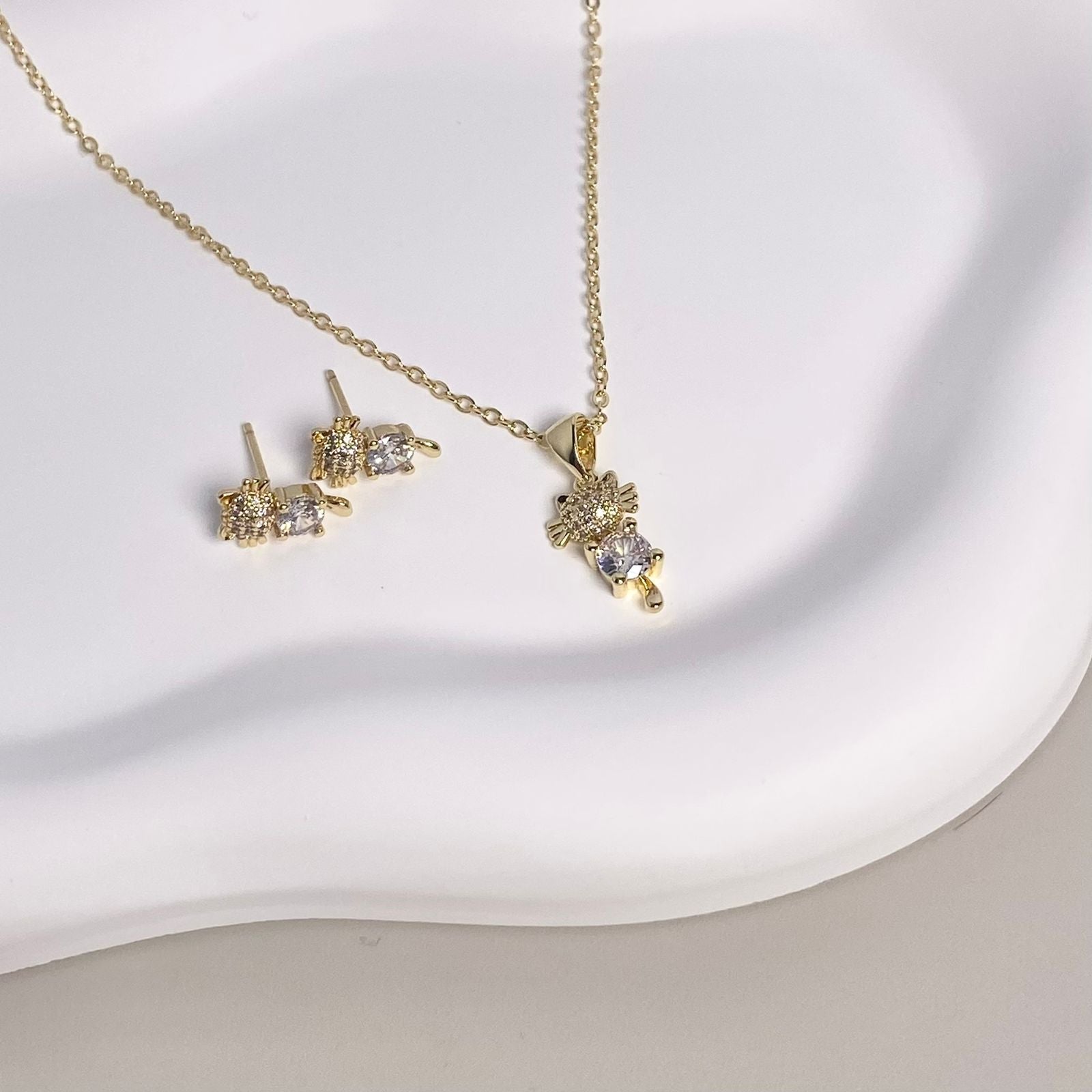 Elegante set de gato en baño de rodio. Diseño delicado y sofisticado que combina estilo con versatilidad. Perfecto para complementar tu look diario o especial. Acabado brillante que resalta la belleza del detalle felino. Una pieza única que refleja tu personalidad.