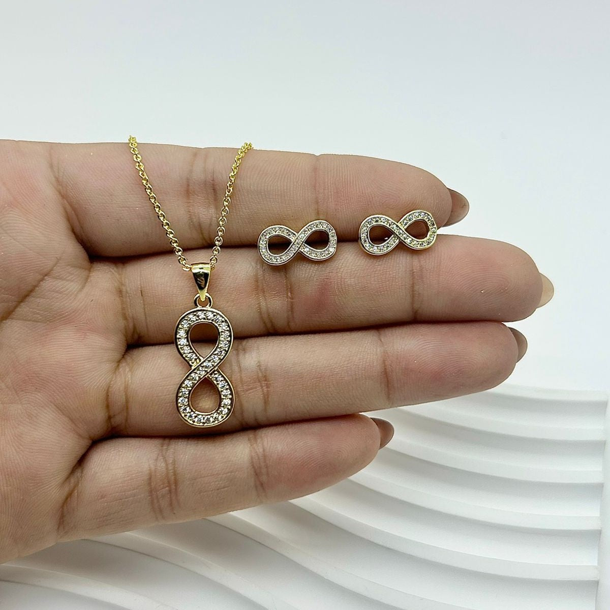 Set completo de dije y topo de infinito en baño de rodio.